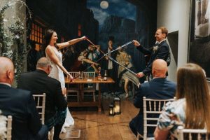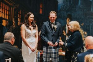 So, at the appropriate point in the ceremony, the mother of the bride poured in a good measure of champagne whilst the mother of the groom did likewise with the fine malt whisky. This unique blend seemed to work well, as the quaich was entirely empty after this part of the ceremony! As well as the quaich ceremony, hand-fasting also featured in Kathleen and Lewis’s wedding, as is described on quaichshop’s page on quaichs and weddings. Despite being assisted by the bride’s father, this part of the ceremony also went well!