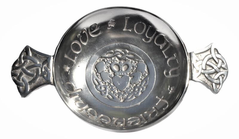 A pewter toasting quaich containing an image of the Claddagh which represents love, loyalty and friendship.