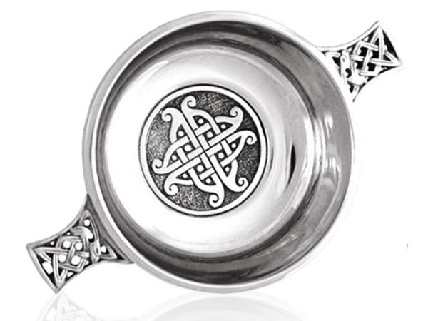 Pewter quaich with celtic knotwork design insert in the bowl.