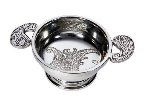 Pewter quaich with paisley pattern engraved in the bowl